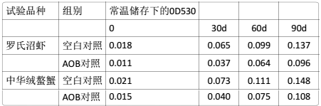將捕撈后的羅氏沼蝦和中華絨螯蟹分別放入清水池中暫養(yǎng)20~24h(增氧),在暫養(yǎng)水中加入0.015%的AOB,在吐納消化道內(nèi)殘留物的同時,蝦、蟹體內(nèi)攝入一定量的AOB抗氧成分。將完成暫養(yǎng)后的蝦、蟹加工成軟罐頭,分別進(jìn)行常溫和低溫保藏以及高溫促氧化實驗,在暫養(yǎng)水中添加AOB顯著增強了制品的抗氧化能力,成品的色澤保持性能明顯好于對照(p<0.05),并有效抑制了蝦紅(青)素的氧化褪色和蝦頭的氧化變黑;在35±1oC的保藏實驗中胖袋率顯著降低(p<0.05),表現(xiàn)出一定的抑菌保鮮效果。軟罐頭常溫儲存3個月后,蝦蟹肌肉勻漿中丙二醛(MDA)的含量顯著低于空白對照。如下表所示: