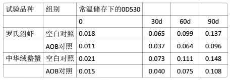 將捕撈后的羅氏沼蝦和中華絨螯蟹分別放入清水池中暫養(yǎng)20~24h(增氧),在暫養(yǎng)水中加入0.015%的AOB,在吐納消化道內(nèi)殘留物的同時,蝦、蟹體內(nèi)攝入一定量的AOB抗氧成分。將完成暫養(yǎng)后的蝦、蟹加工成軟罐頭,分別進行常溫和低溫保藏以及高溫促氧化實驗,在暫養(yǎng)水中添加AOB顯著增強了制品的抗氧化能力,成品的色澤保持性能明顯好于對照(p <0.05),并有效抑制了蝦紅(青)素的氧化褪色和蝦頭的氧化變黑;在35±1oC的保藏實驗中胖袋率顯著降低(p<0.05),表現(xiàn)出一定的抑菌保鮮效果。軟罐頭常溫儲存3個月后,蝦蟹肌肉勻漿中丙二醛(MDA)的含量顯著低于空白對照。如下表所示: